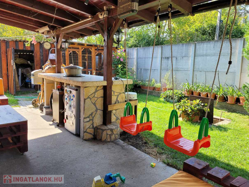 A házhoz tartozik egy kb 30 nm-es terasz, ahol a pult alatt hűtő van és kis tárolók, ahová a sütéshez, tálaláshoz szükséges dolgokat tehetik.